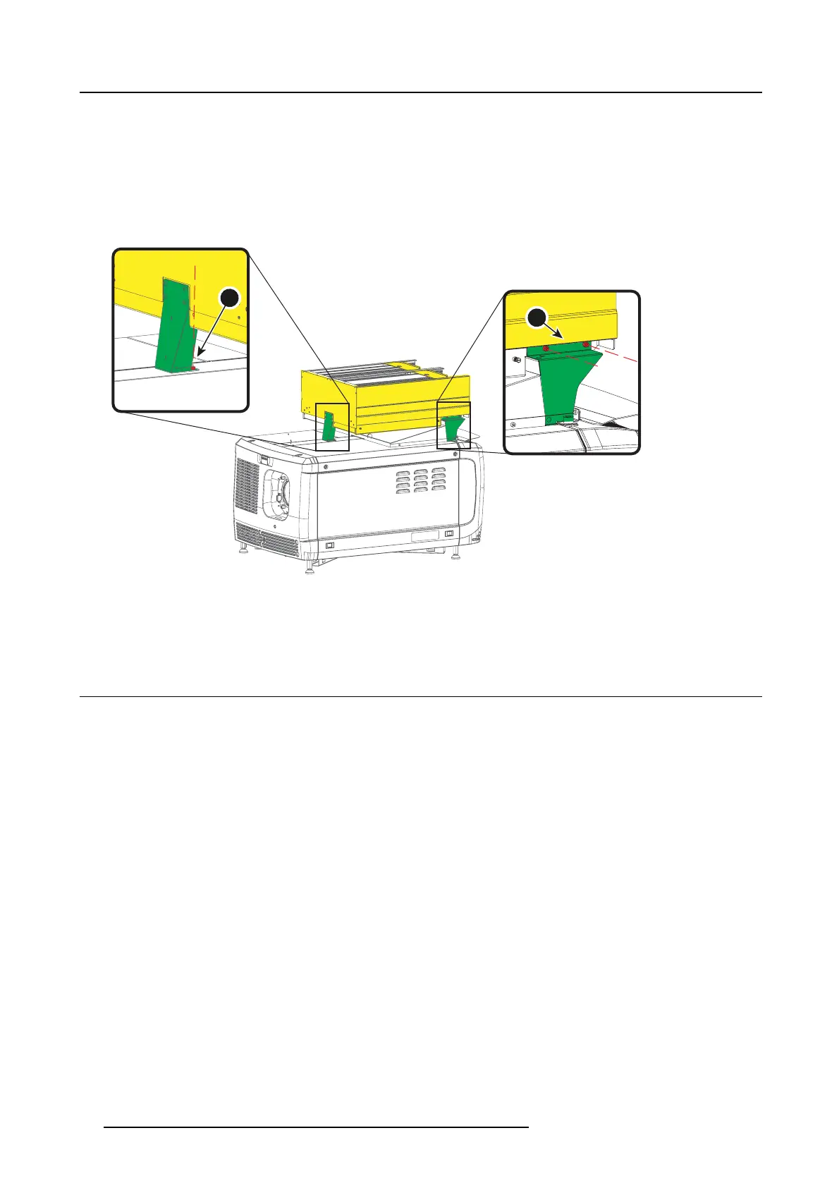 1. P lace the frame assem bly on the projector as indicated. Make sure that the holes of both feet (ref 1) of the projector matches