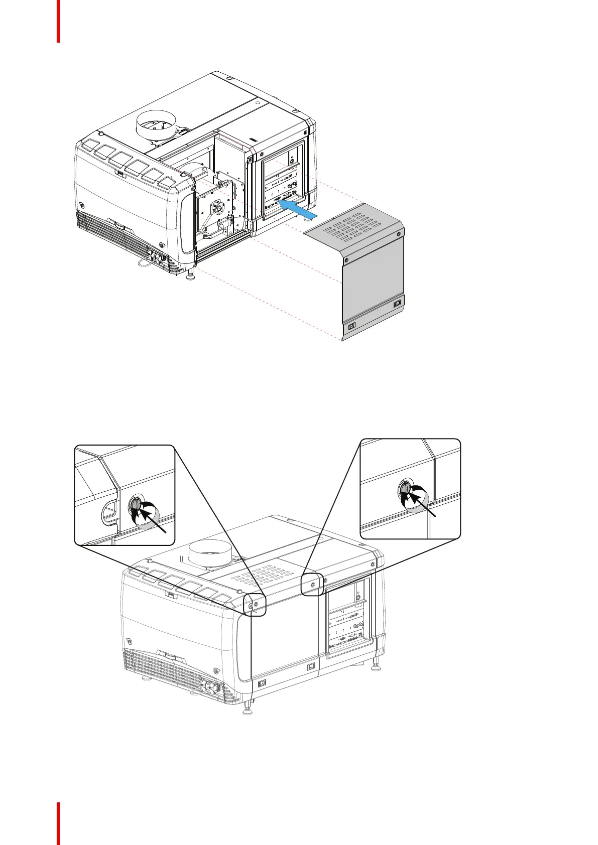 2. Push both lock to each other and push at the same time the cover against the projector frame.
