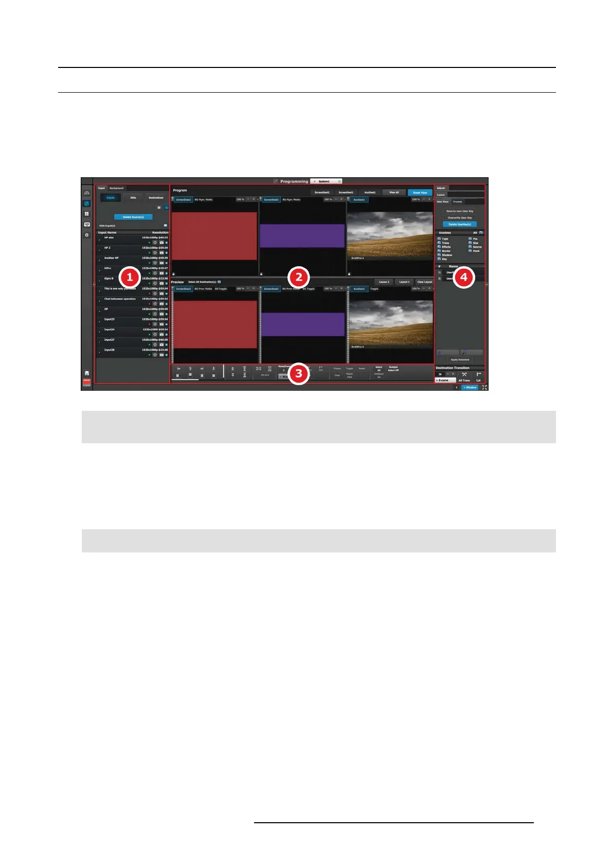 The p rogramm ing page is where the event is set up and everything comes together. Users can define sources from inputs, assign