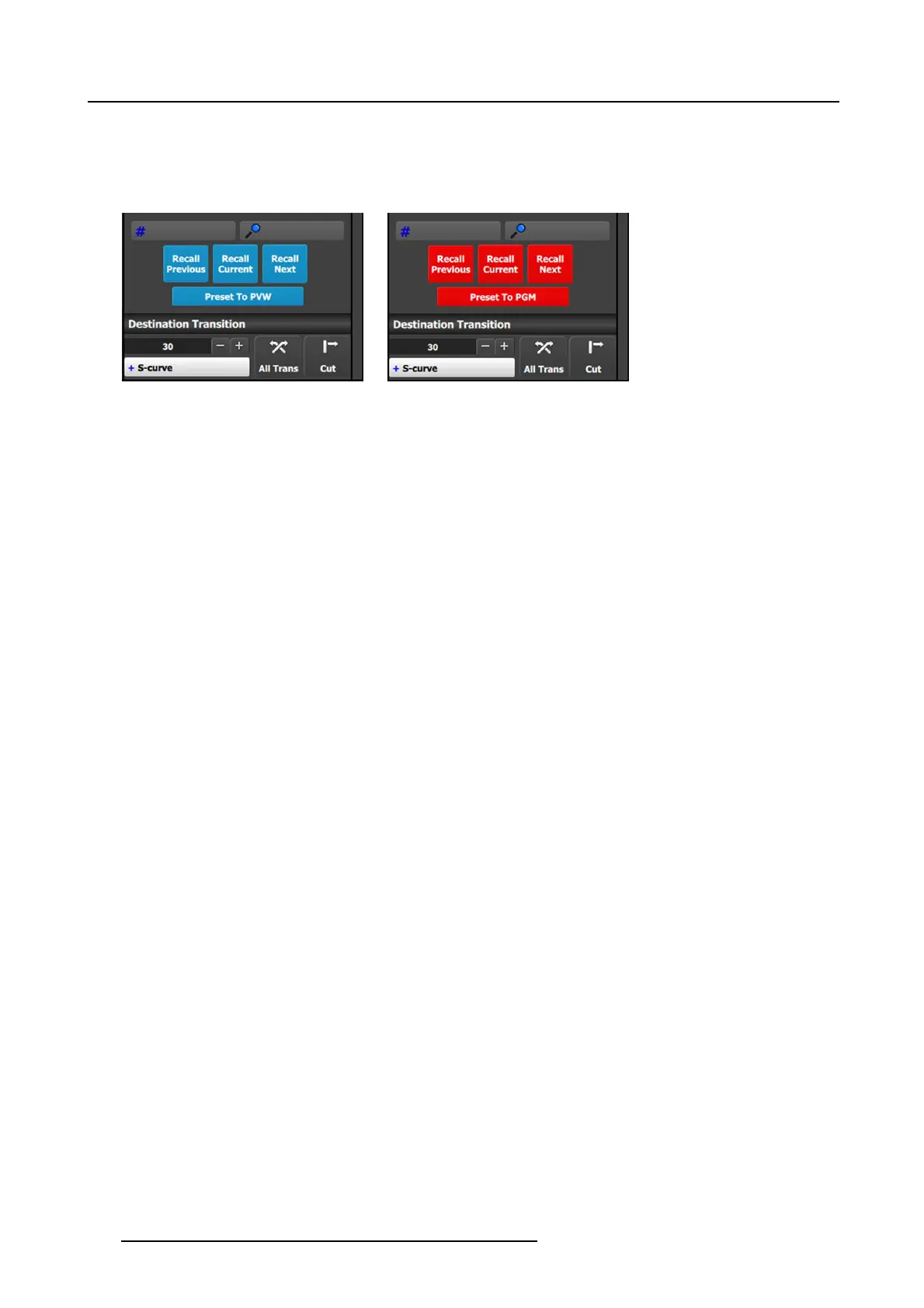 Pressing this button toggles between recalling Presets to Pr eview (see image 6-72) or directly to Program ( see image 6-73). The