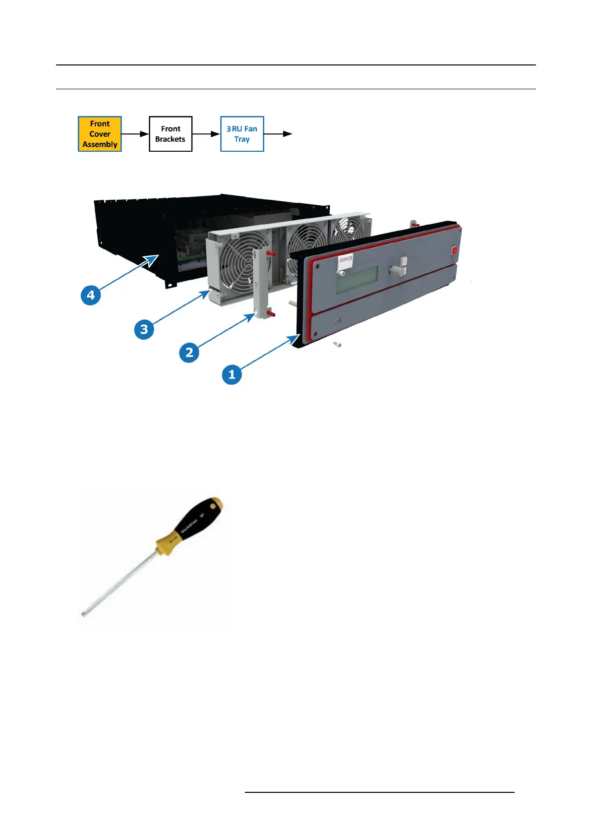 1. Use the Hex screwdriver to remove the 4 screws (Hex 6-32x.25) that attach the front cover to the brackets located be hind it.