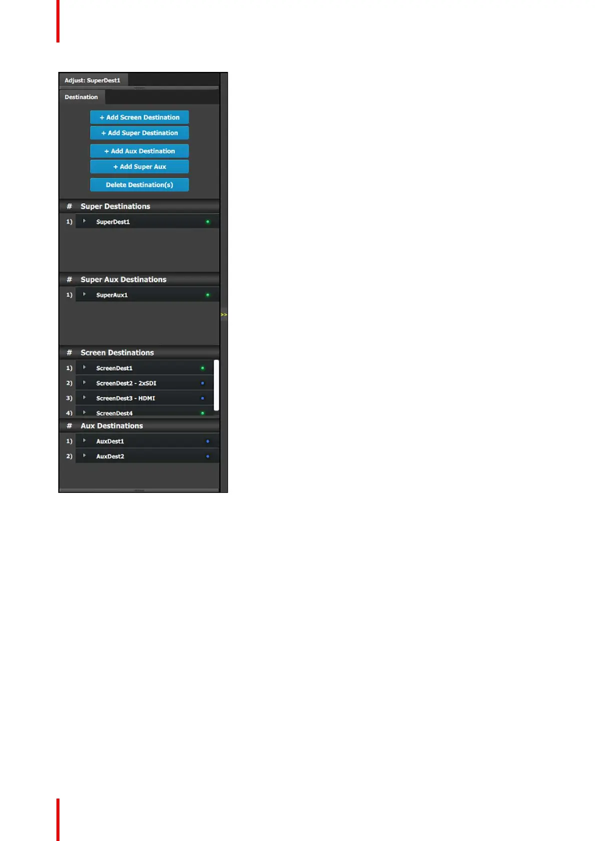 • A list of all the destinations (Screen, Aux) already created on
