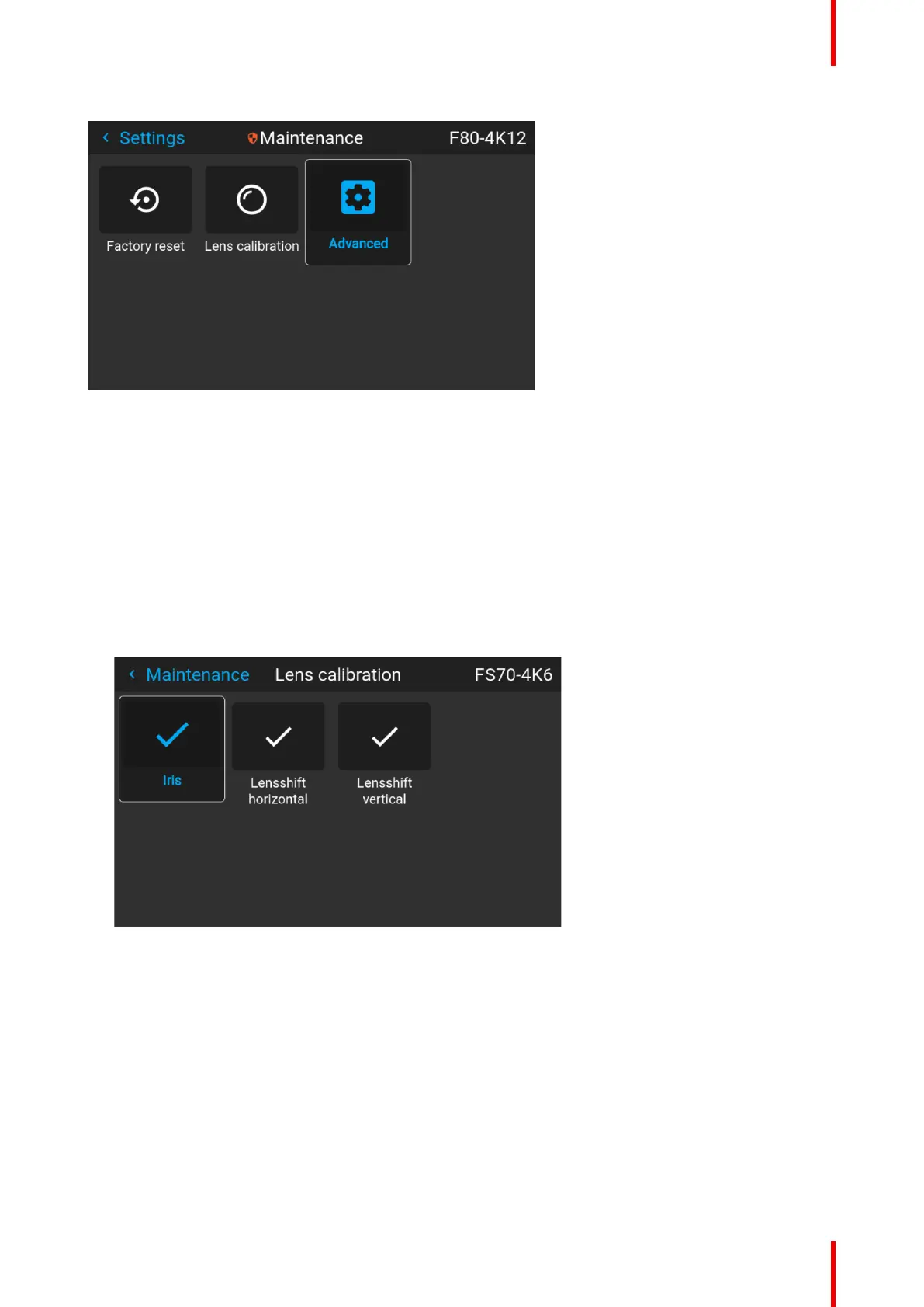 1. Enter the menu Settings / Maintenance / Lens calibration.