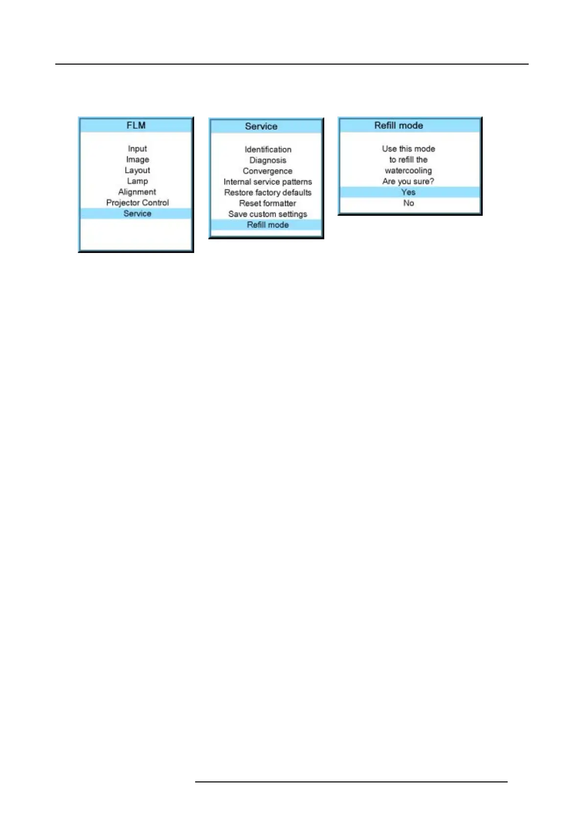 5. Activate the “Refill mode” in the “Service” menu of the projector. As a result the pump starts and the fresh cooling liquid in the