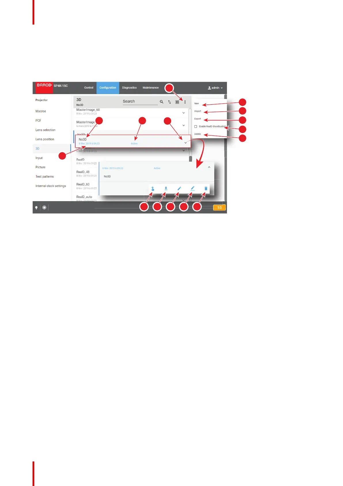 • Export (reference 13) creates a downloadable backup package that contains all 3D files selected in the