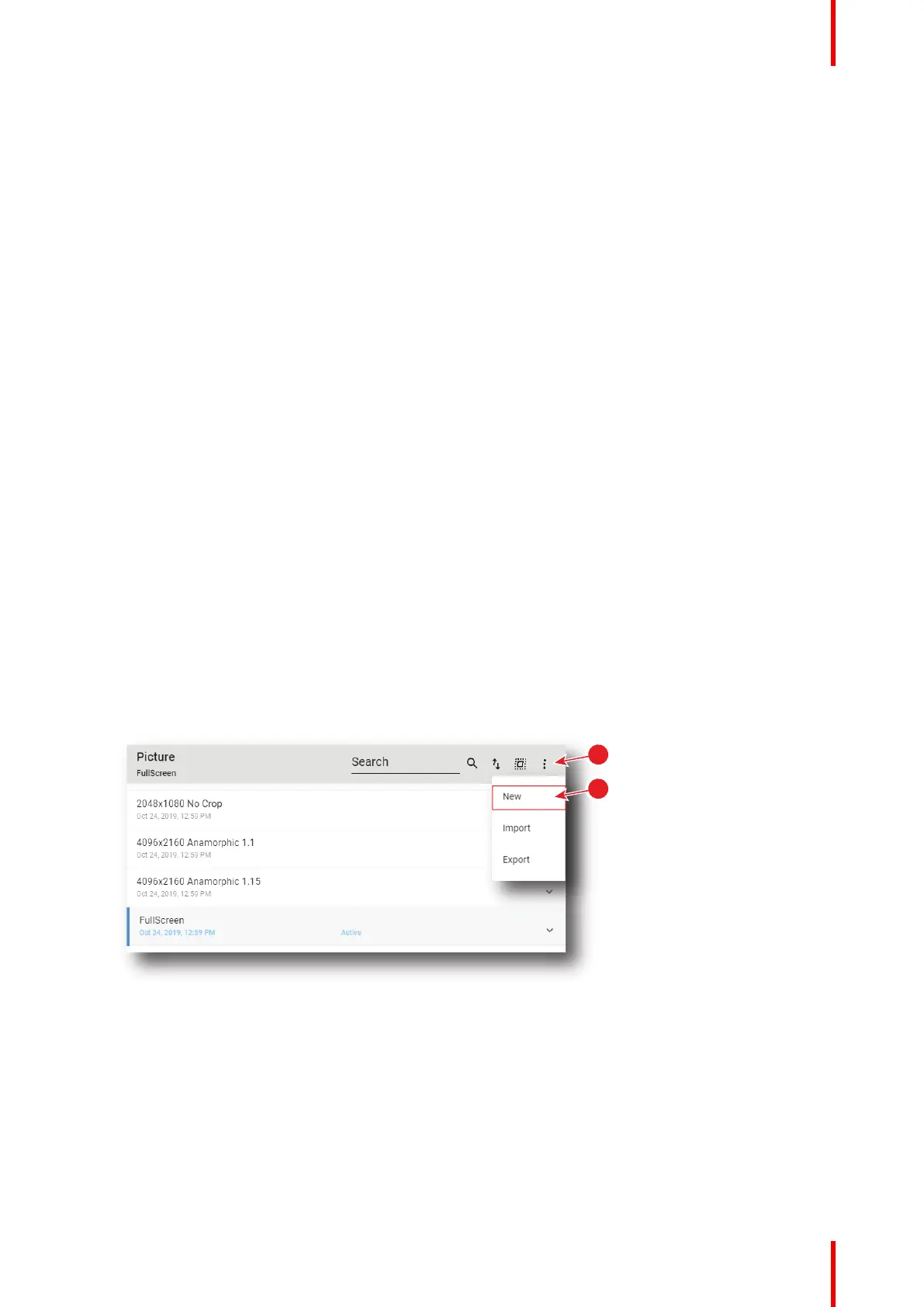1. While in Configuration > Projector > Picture, click on the screen file general menu (reference 1) located on
