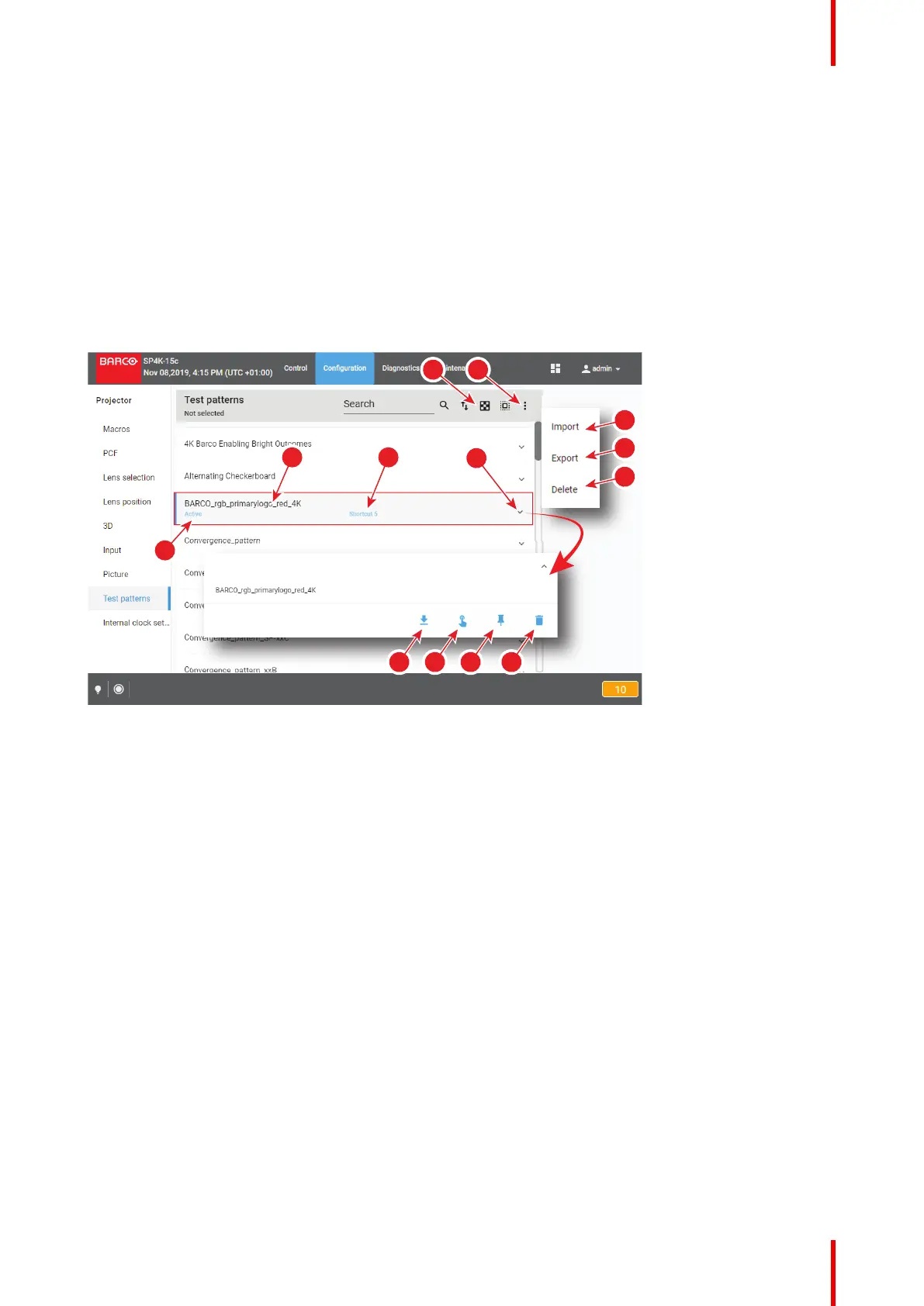 • Import (reference 11) allows to import a test pattern (.PNG) alone (one single file), or a package of test
