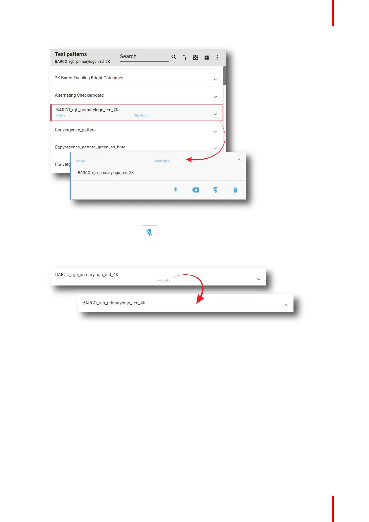 Test pattern is no longer associated with shortcut (e. g. Shortcut 2) and shortcut name is removed from the
