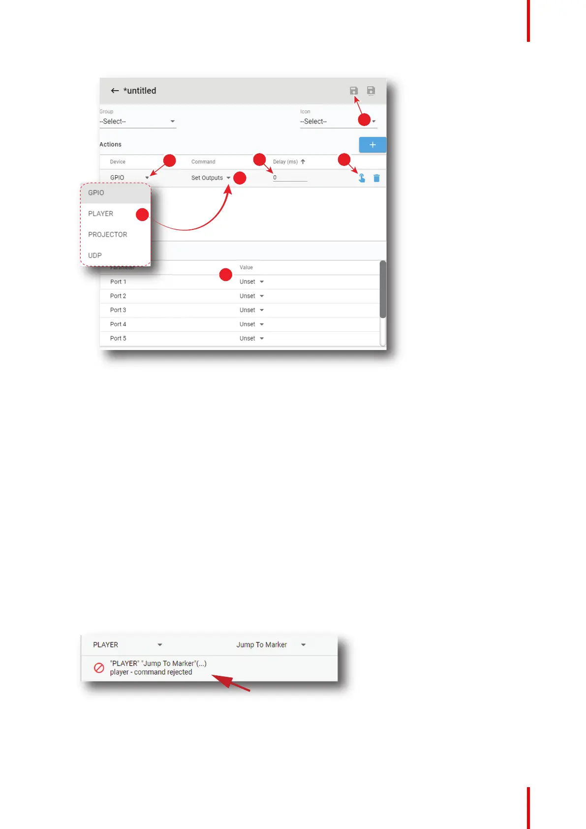 • PLAYER: Allows to access a set of commands tat will be sent to the ICMP Player.