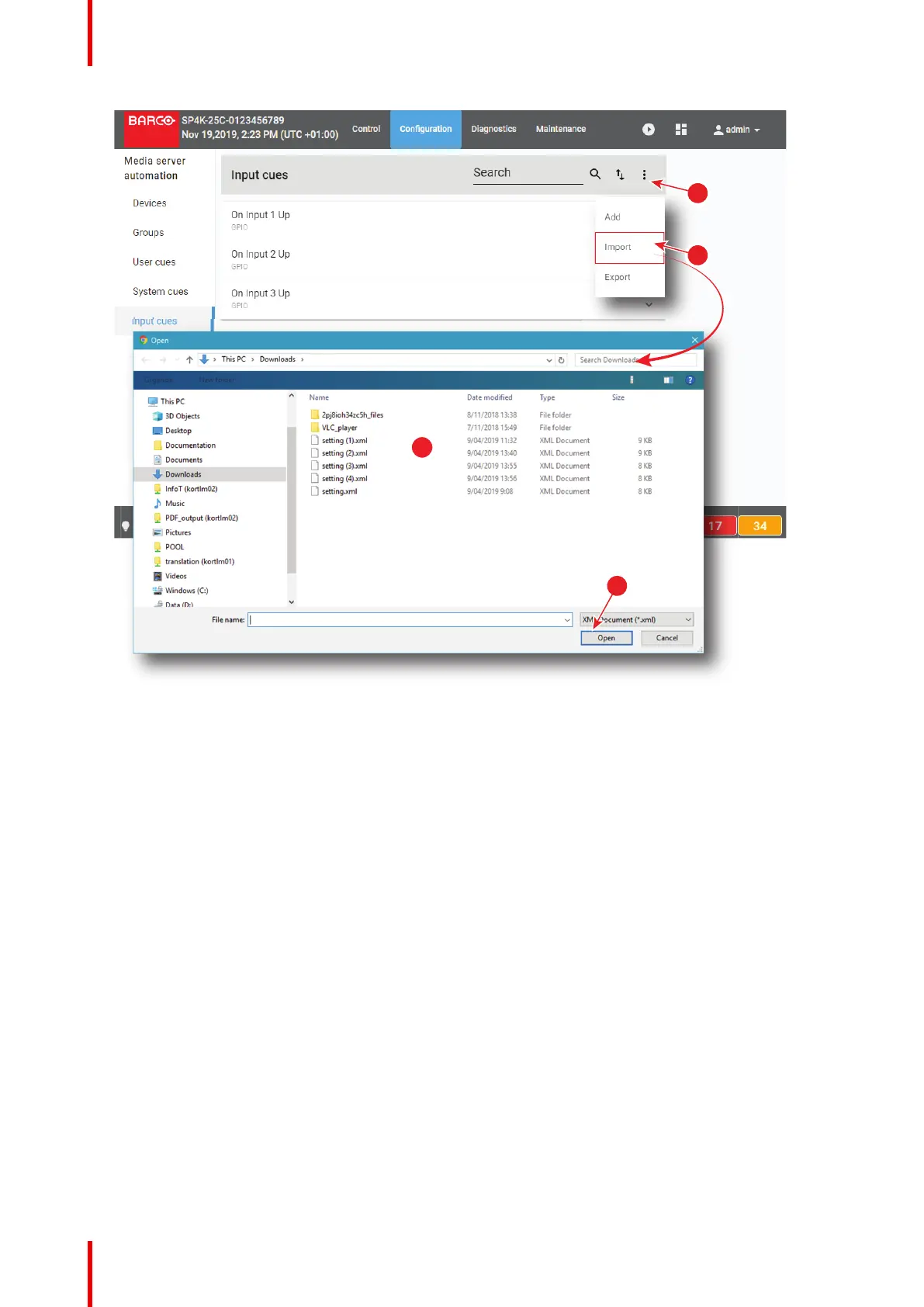 2. Browse to the location of the cue settings file, select the file (reference 3) and click Open (reference 4).