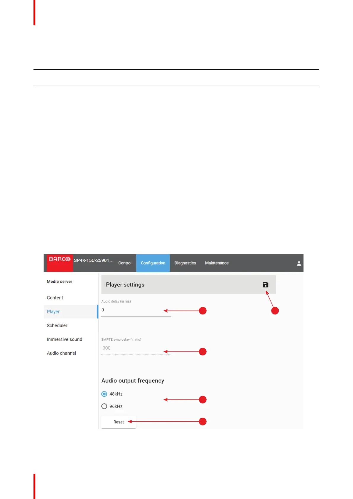 1. While in Configuration > Media sever > Player, click on the audio delay input field and enter the desired