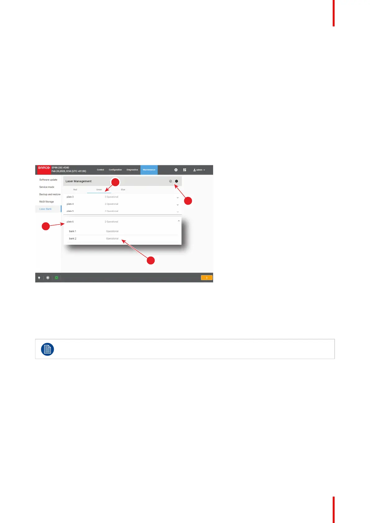 If the system detect an issue on a laser bank its status (reference 3) is change to warning. A non-functional