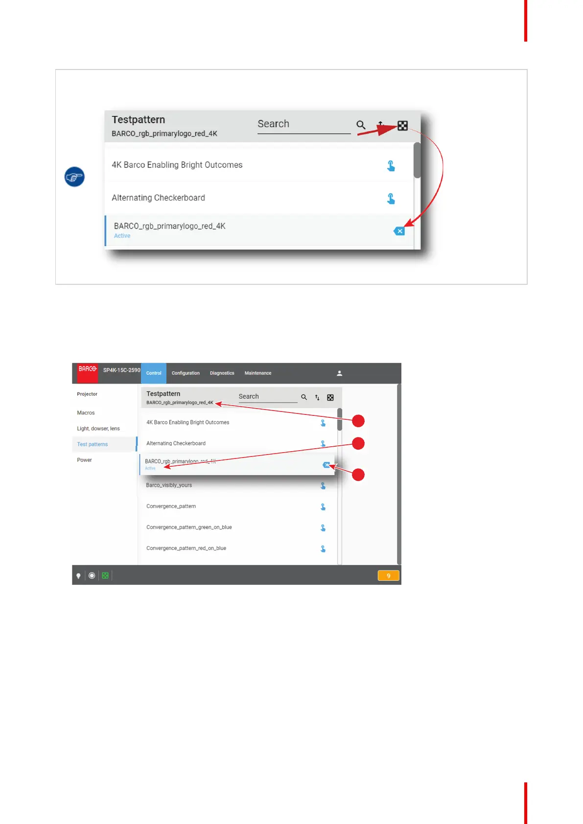 1. While in Control > Projector > Test patterns, locate the currently activated test pattern.
