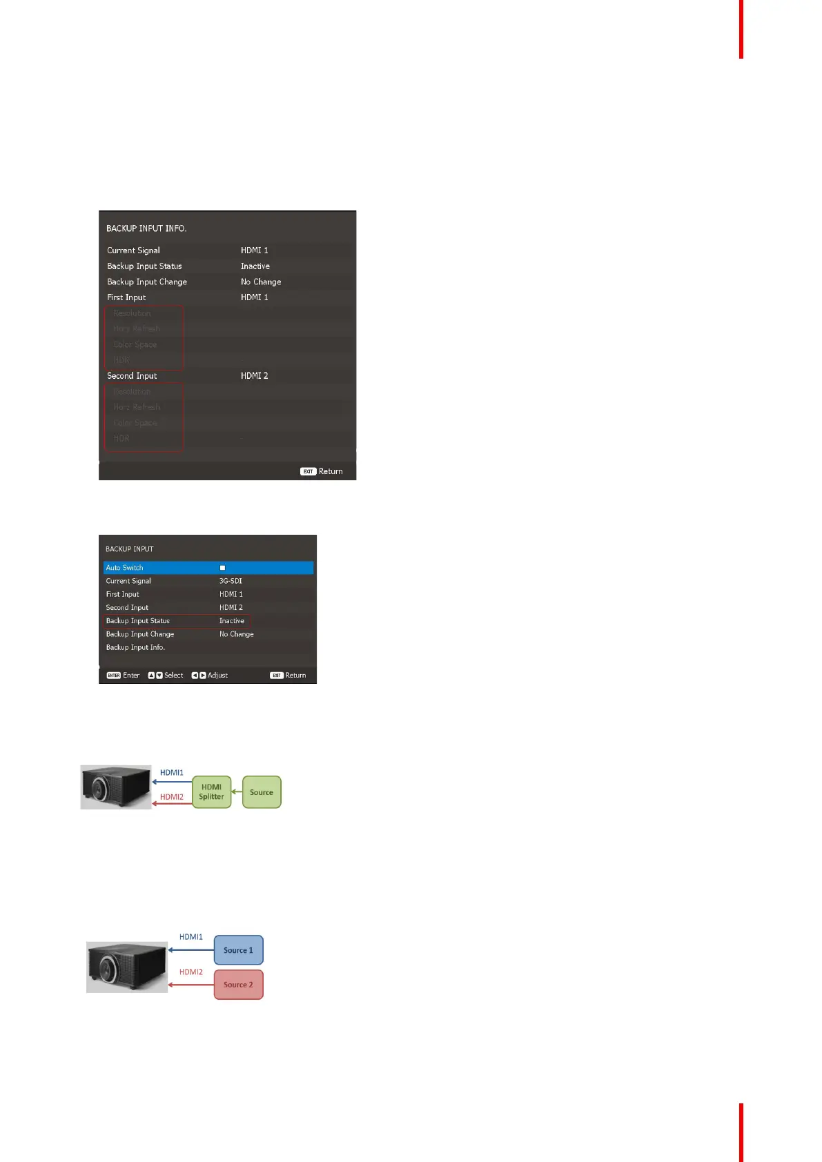 • When Backup Input Status is active, auto switch to HDMI2 seamlessly when HDMI1 is lost.