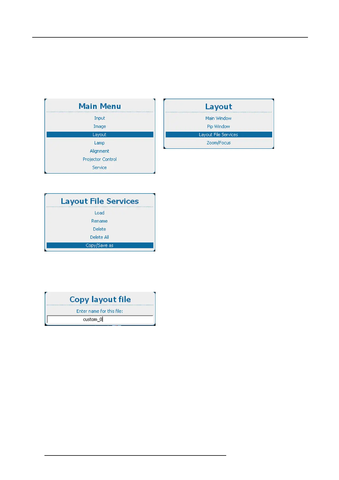 1. Press Menu to activate the menus and select Layout → Layout File Ser vices → Copy/Save as .