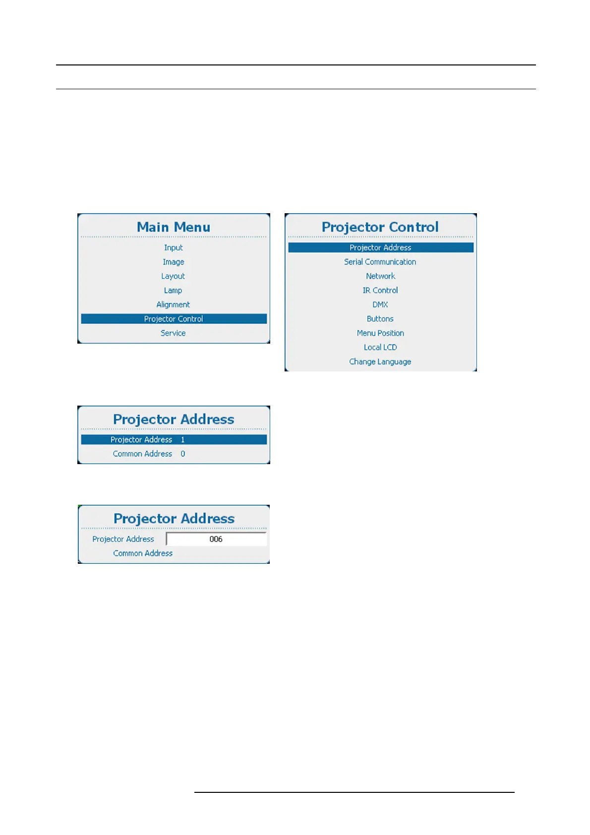 1. Press Menu to activate the menus and select Projector Control → Projector Address → P rojector A ddress.