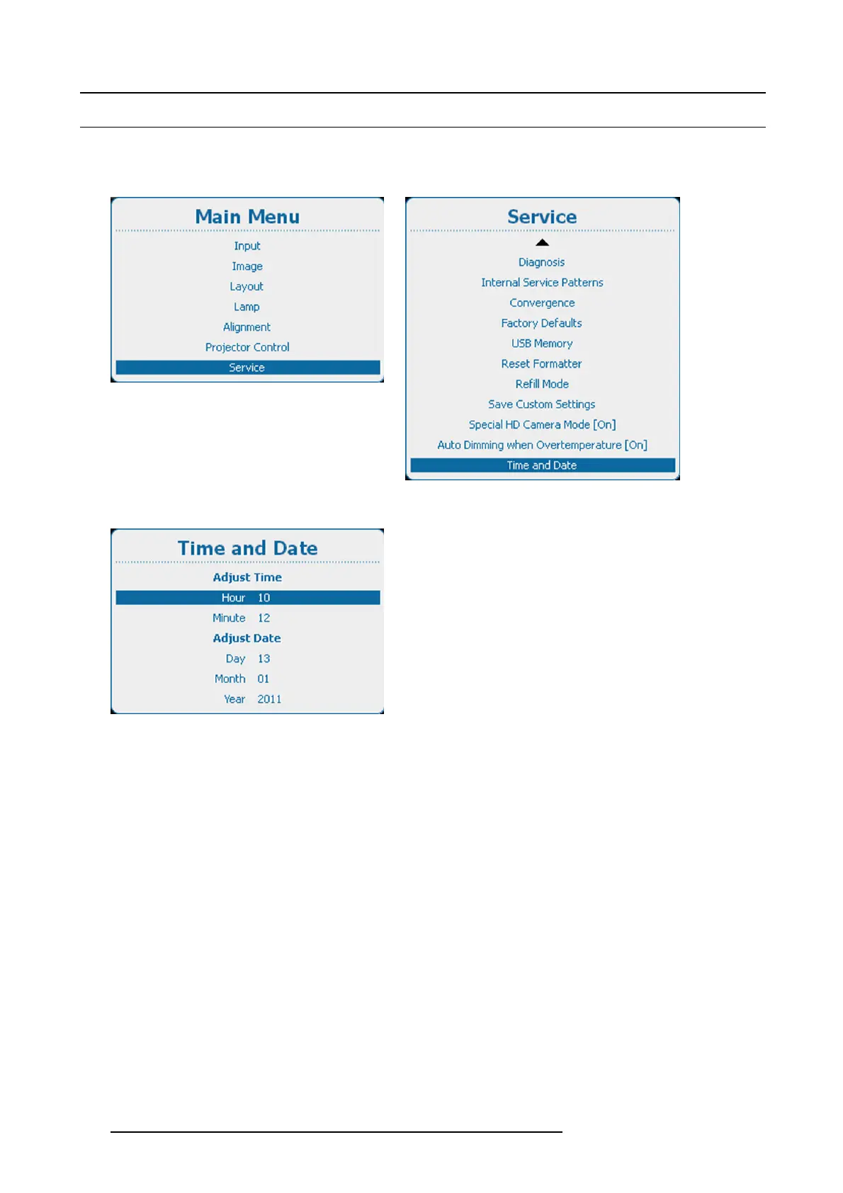 1. Press Menu to activate the menus and select Service → Time and Date.