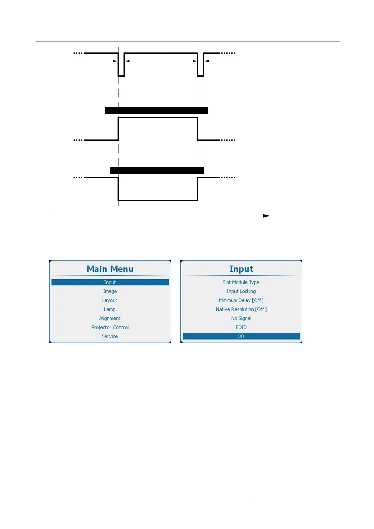 1. Press Menu to activate the menus and select Alignmen t 3D Glasses L/R S ynchronisation.
