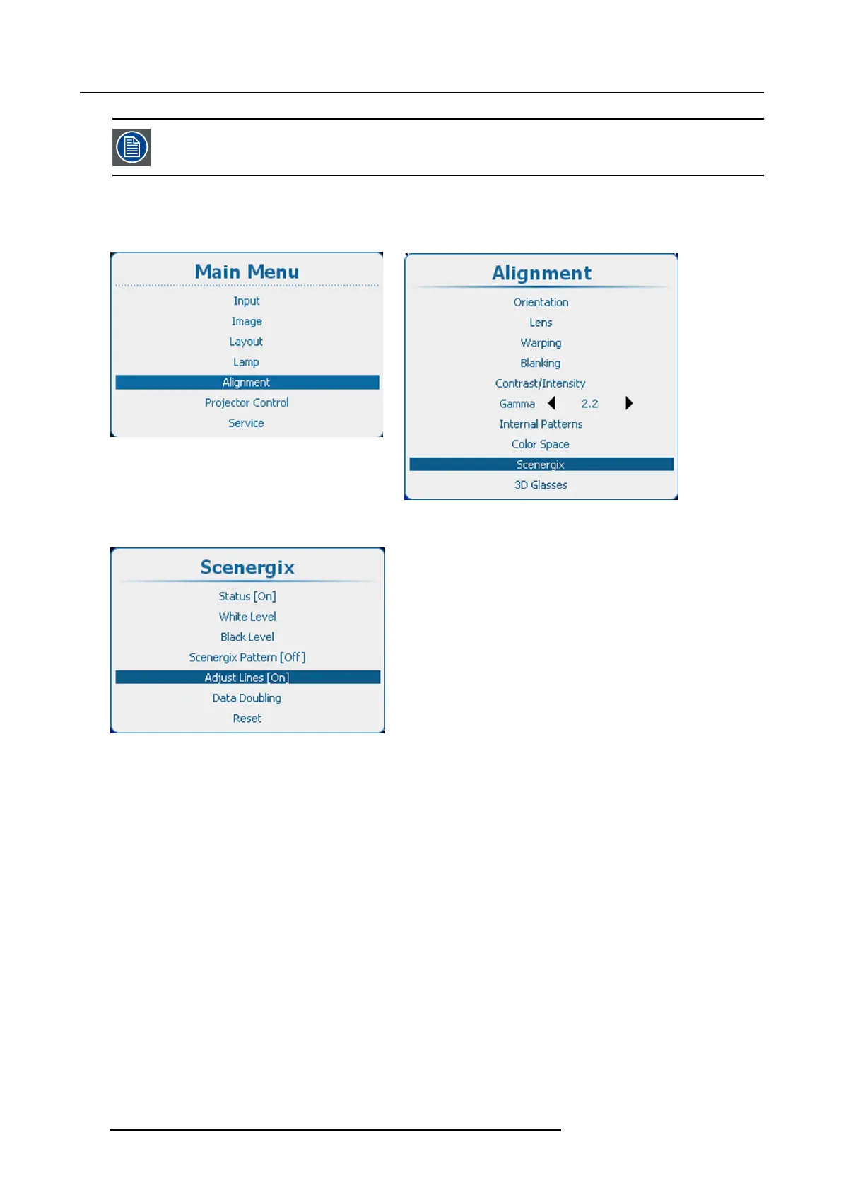 1. Press Menu to activate the menus and select Alignment → Scenergix → Adjust lines.