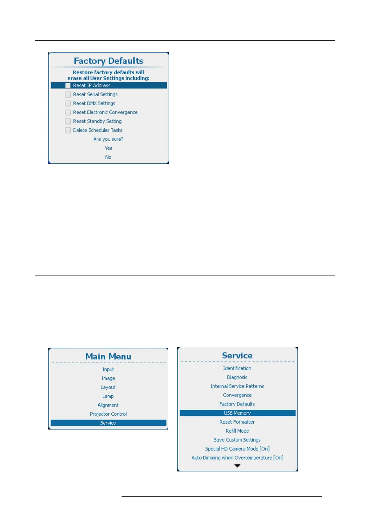 1. Press Menu to activate the menus and select Service → USB M emo ry.