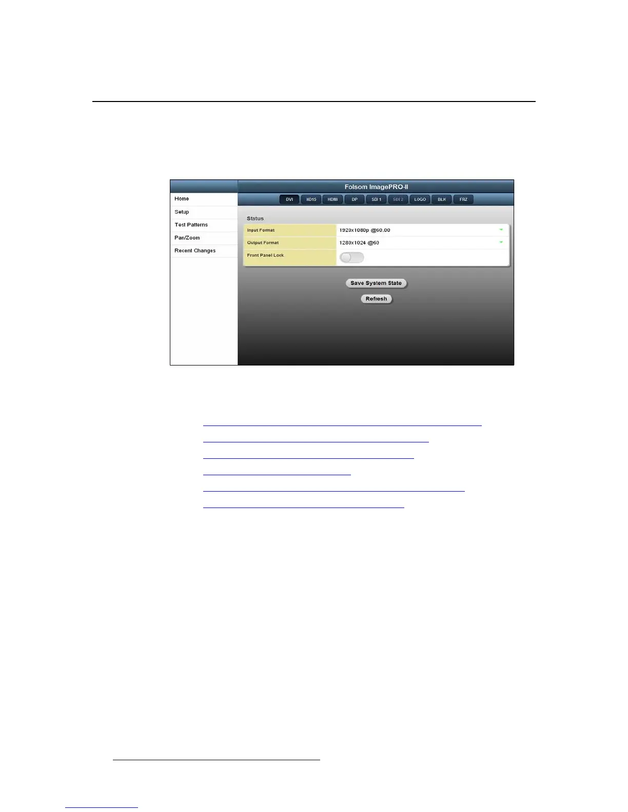 output format, lock the front panel, save custom settings, refresh the page, or navigate