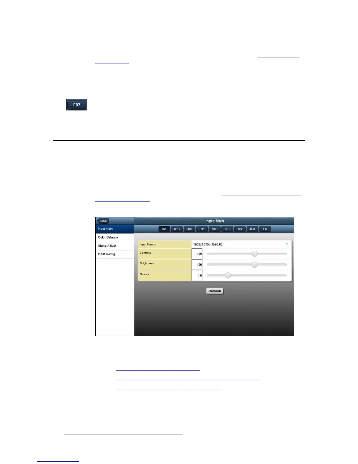 The Input Main page lets you adjust the input format, contrast, brightness, and gamma