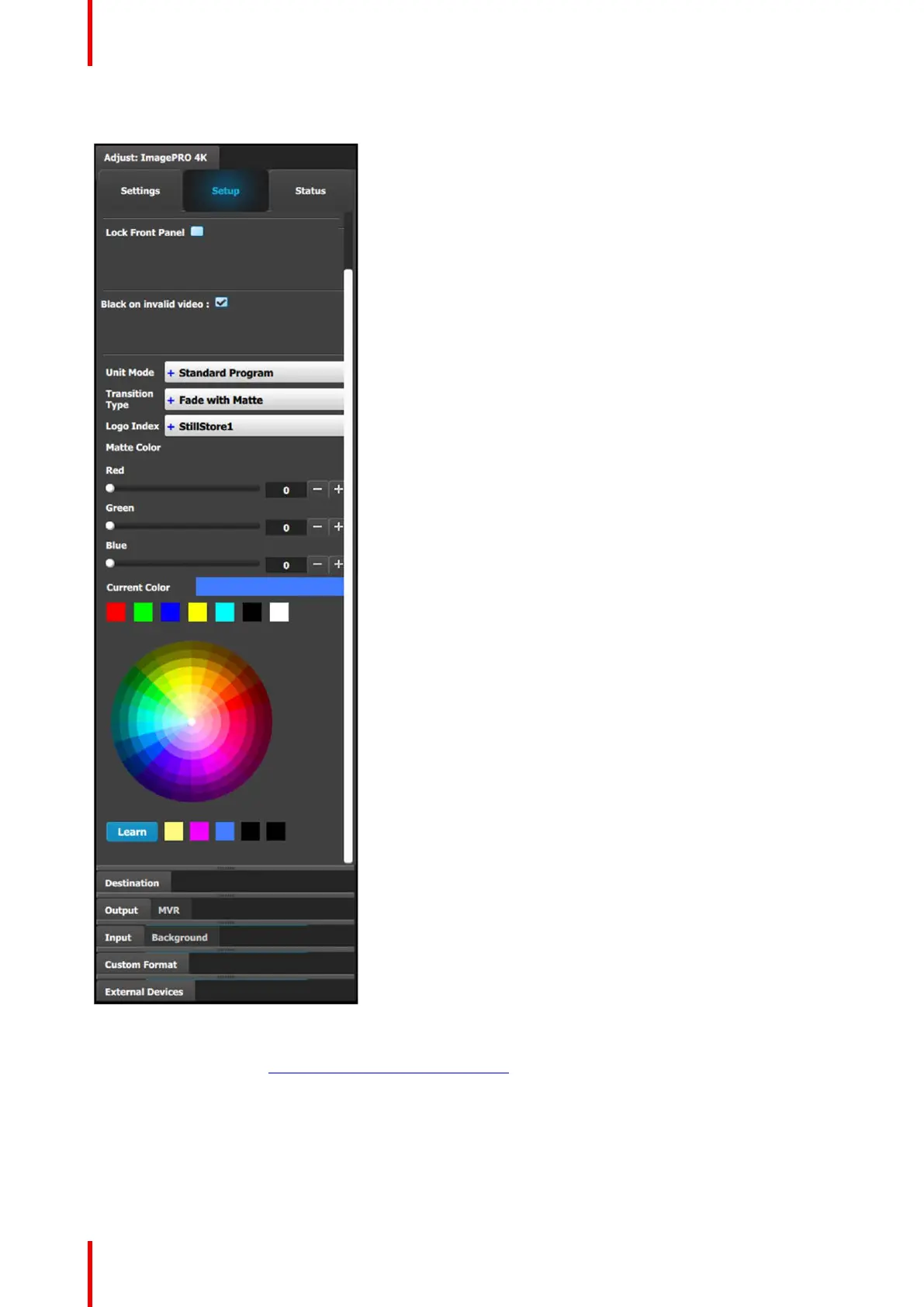 this tab the operator can assign a matte or a logo to an Output (Aux) channel.