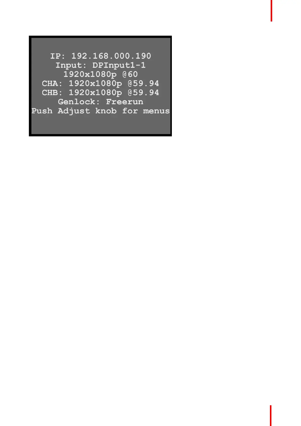 Genlock status. The status screen also displays a message telling the user to push the Adjust knob to access