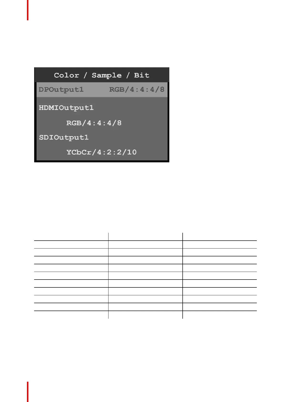 Color/Sample/Bit choices for DP, HDMI, and SDI are: