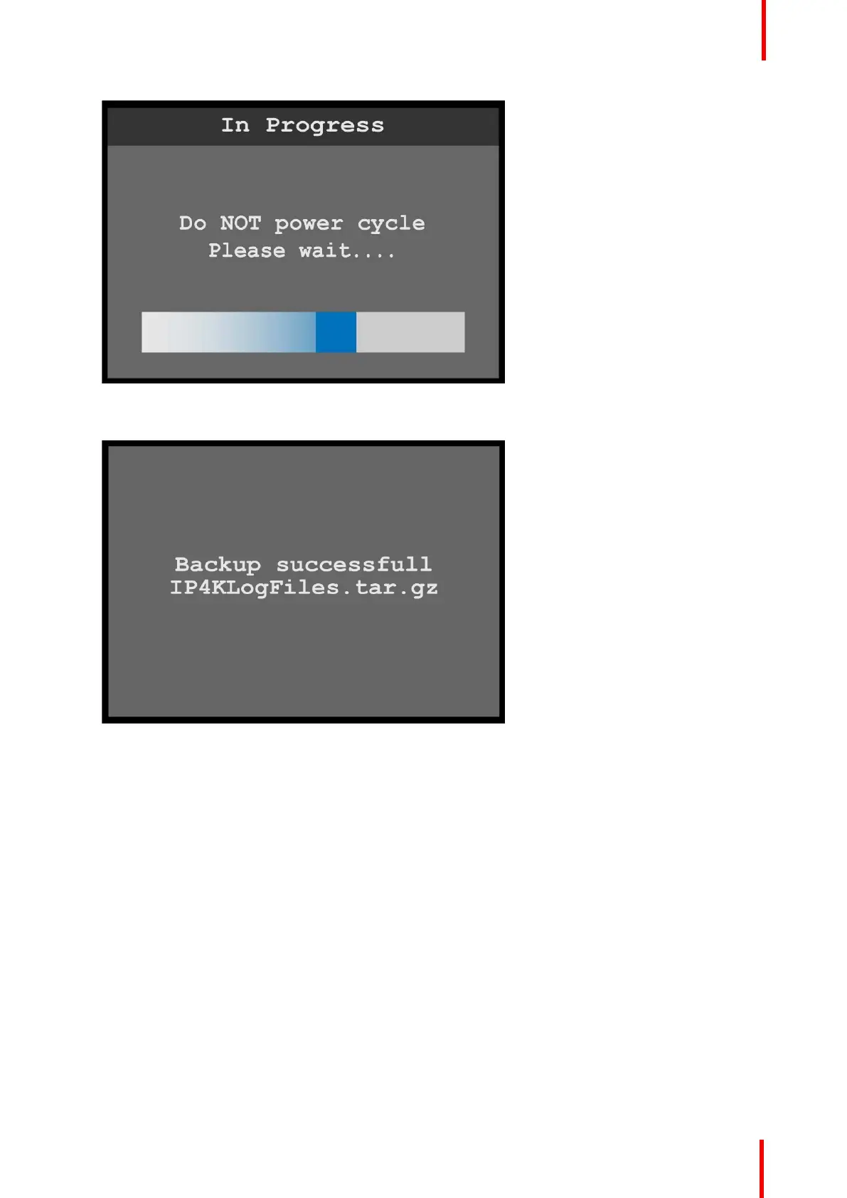 The system stores the backup file—IP4KLogFiles.tar.gz—in the EM folder on the USB drive.