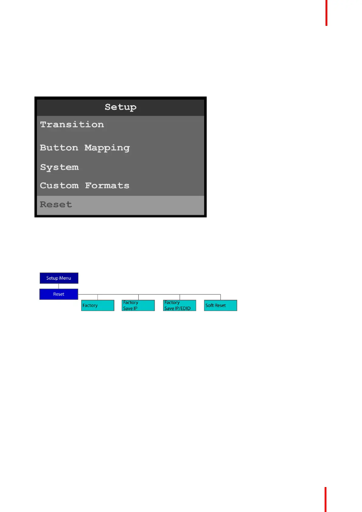 To enter the Reset menu from the System menu, scroll to and select Reset.