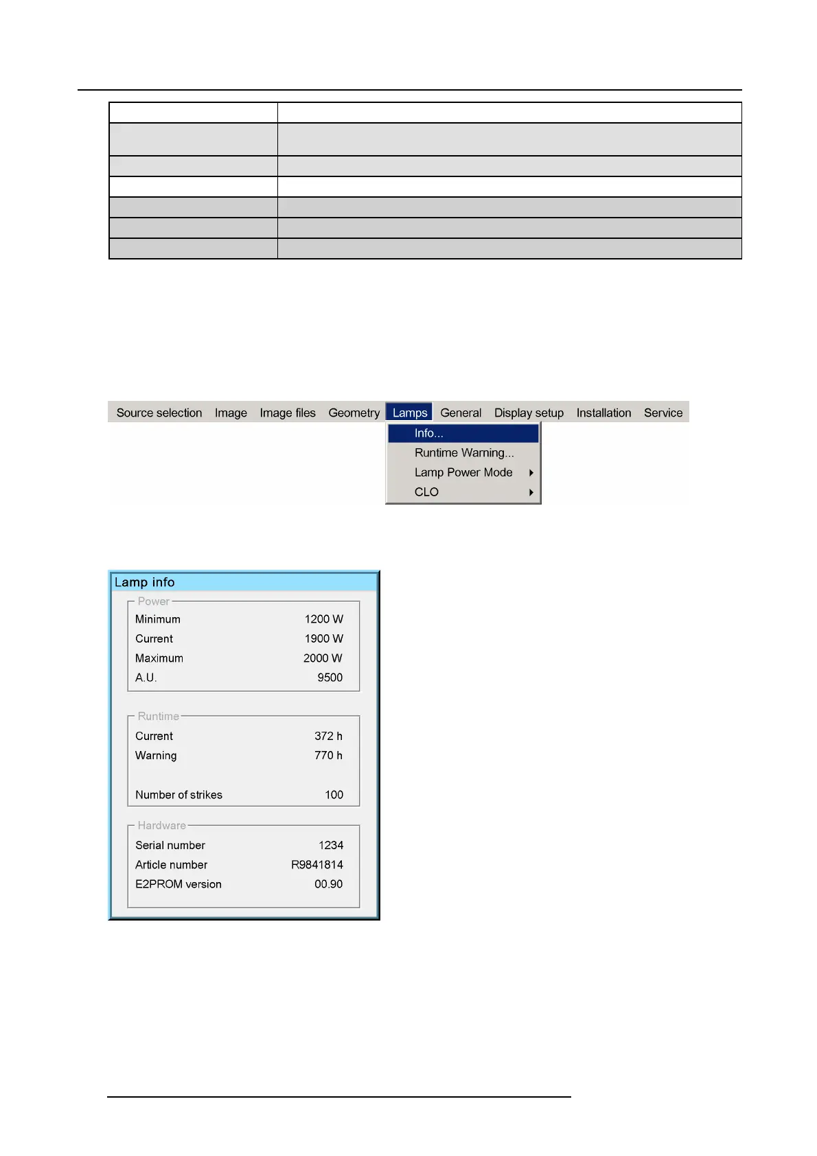 warning can be set in a range from 30 to 200 hours. The runtime warning is displayed by default at 30 hours before end of lamp