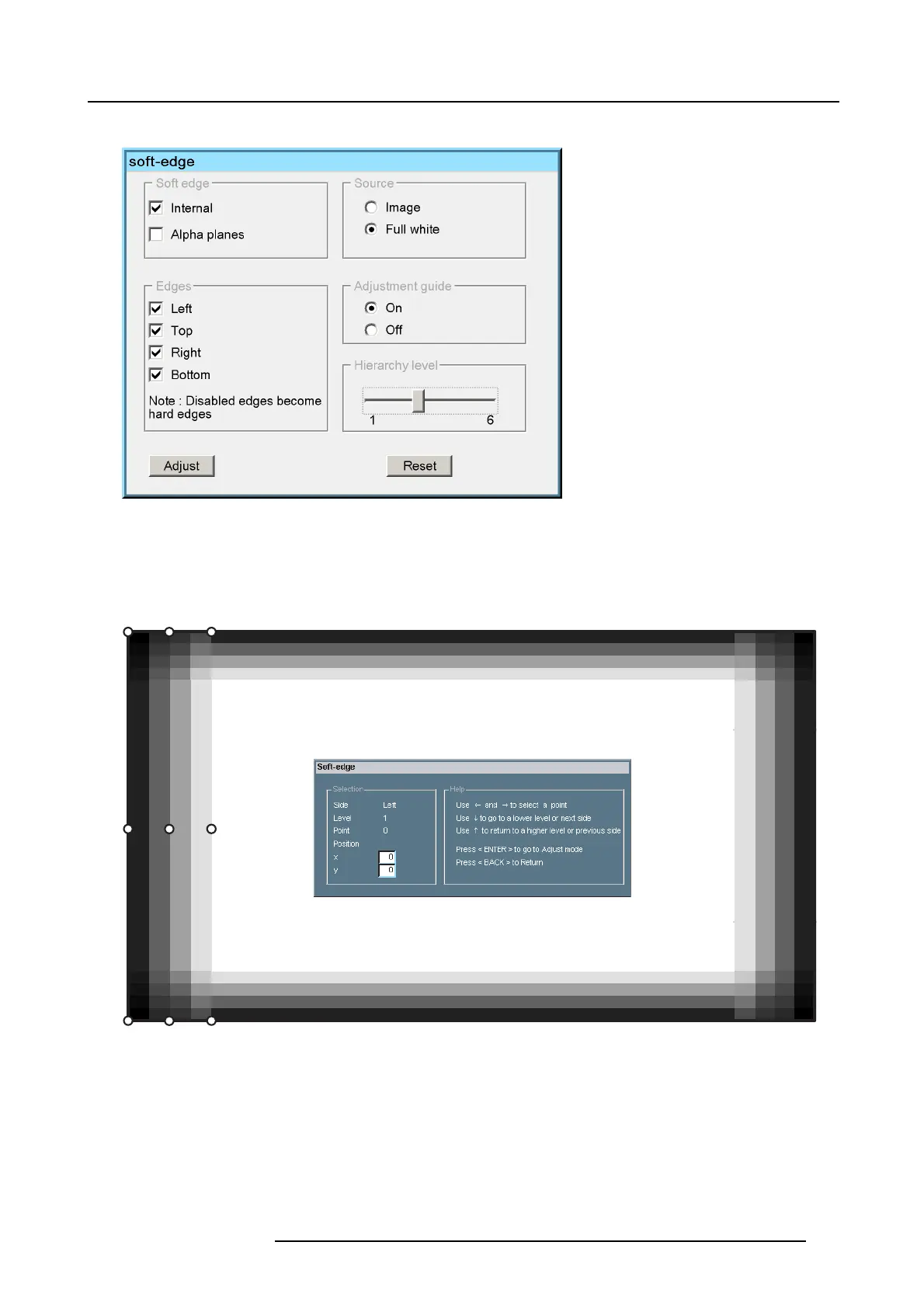 A Edit dialog box is displayed and the left side soft edge zone is selected. The default level is the level 1.