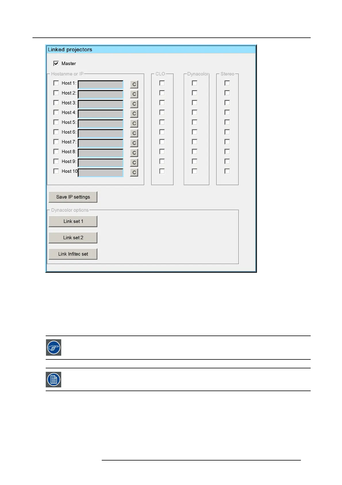 1. In the linked projector menu of the master projector, Select the Hostx check box and press ENTER