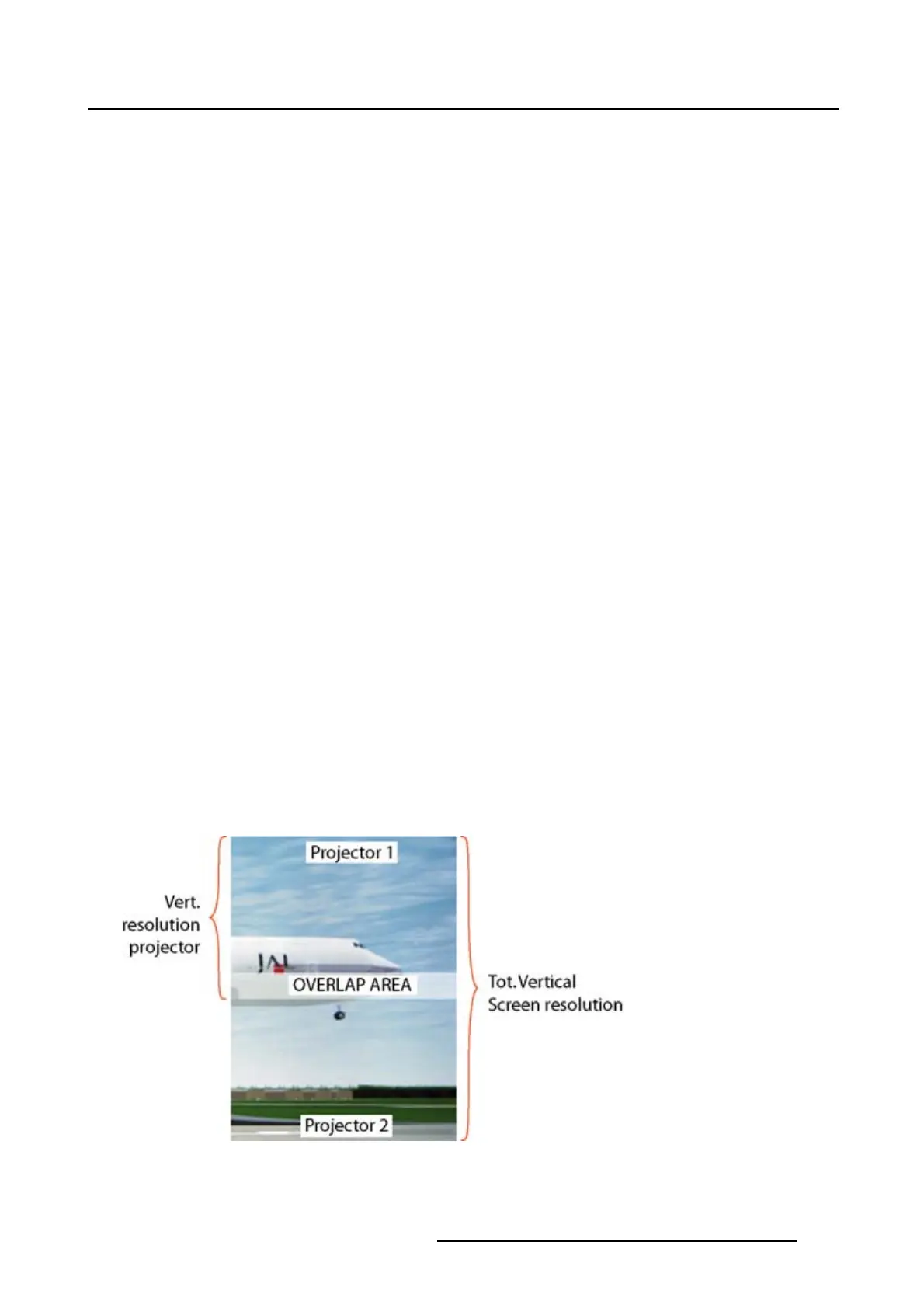 Total horizontal screen resolution : [(horizontal resolution of 1 projector) x 2] minus overlap.