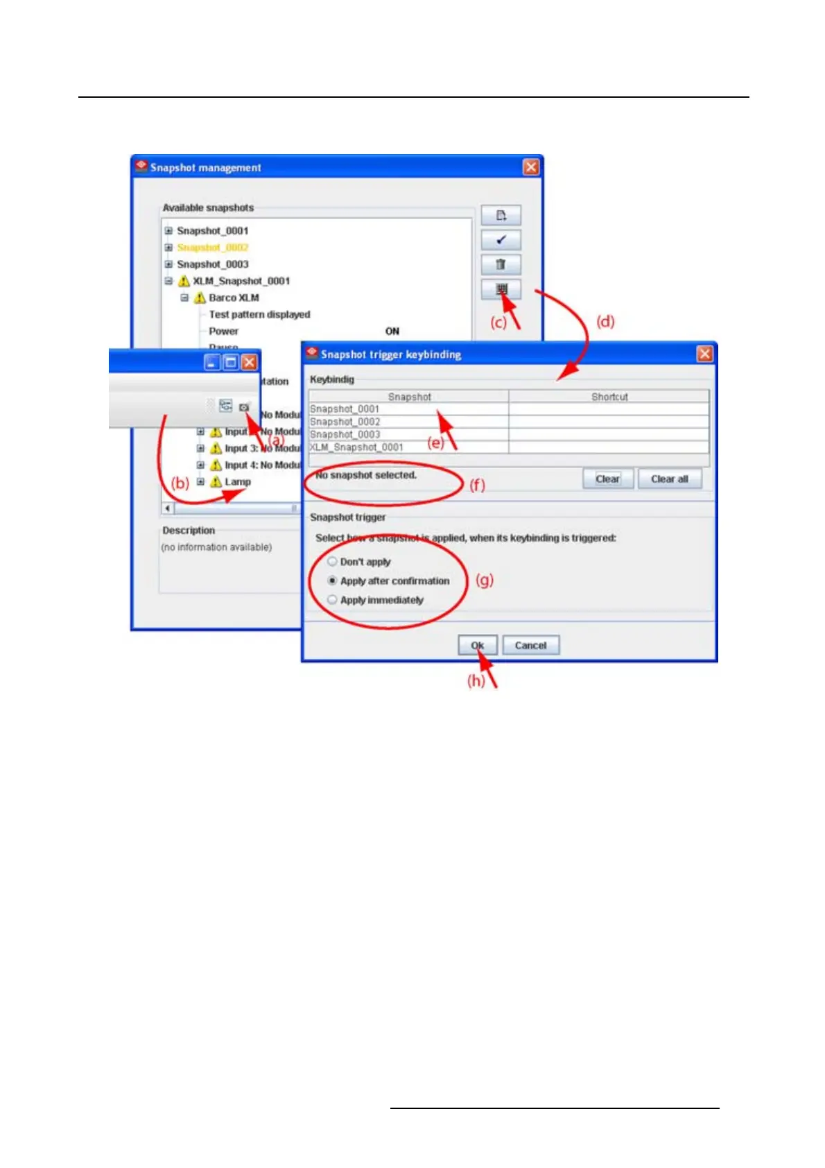 The Snapshot trigger keybinding dialog box opens (d).