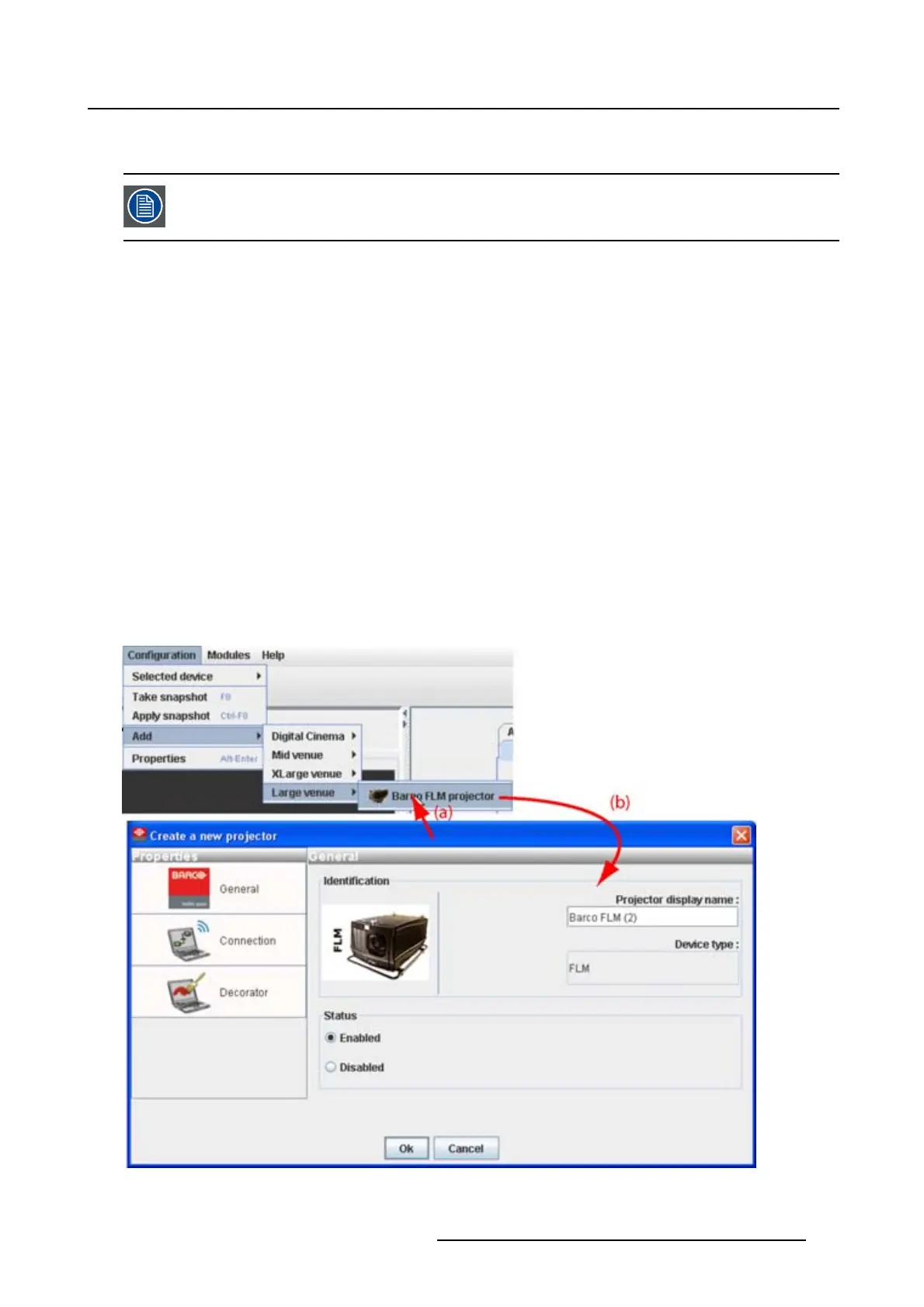 The Create projector dialog box opens with the selected device type pictograph at the right side (b).