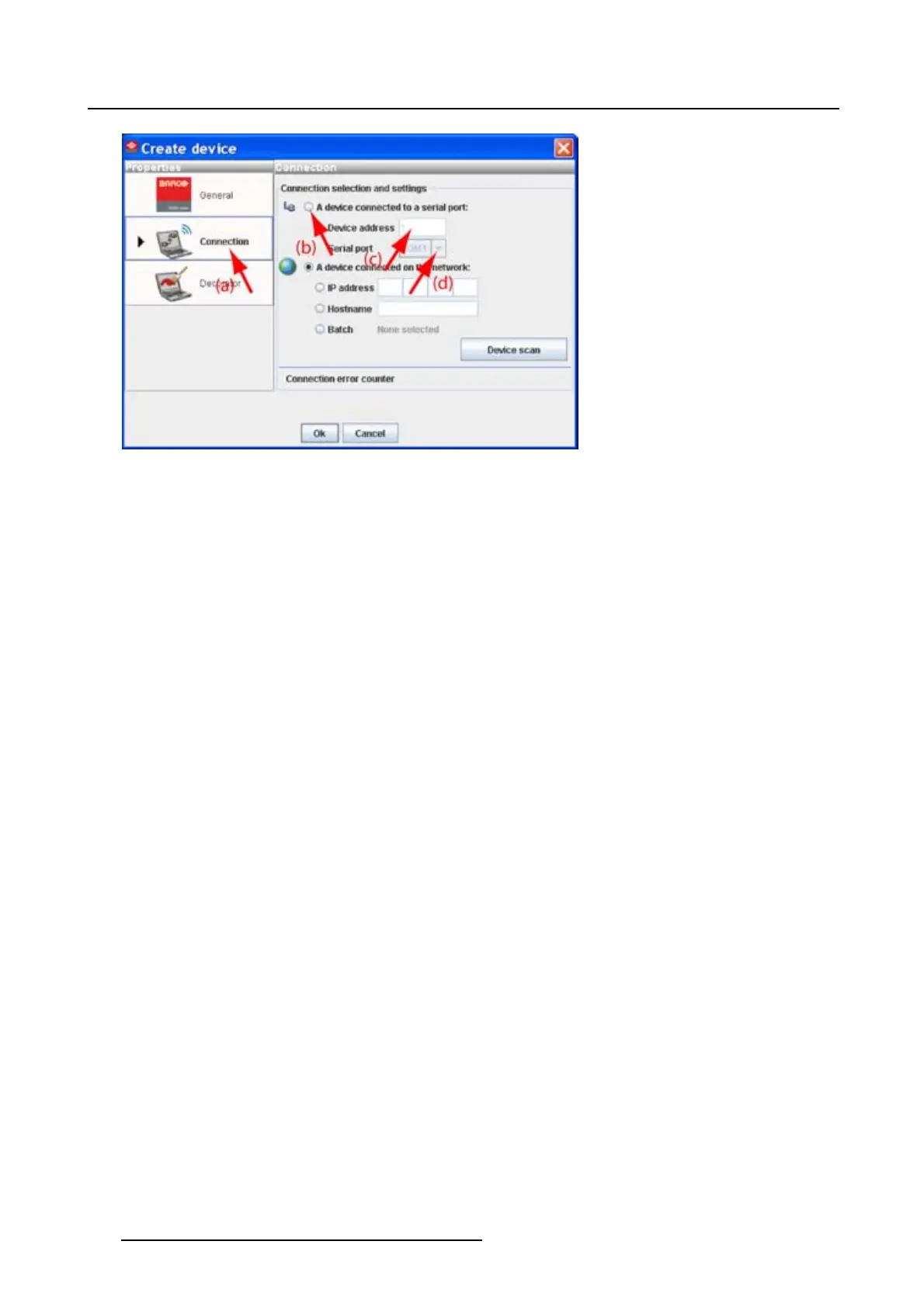 If the projector address and the communication port are not known, click on Device scan to get an