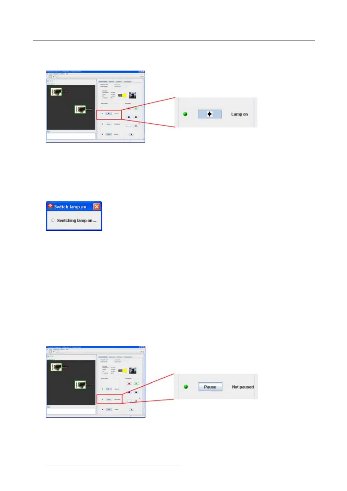 The pause status is indicated by the led color in front of the pause button and by the text indication right
