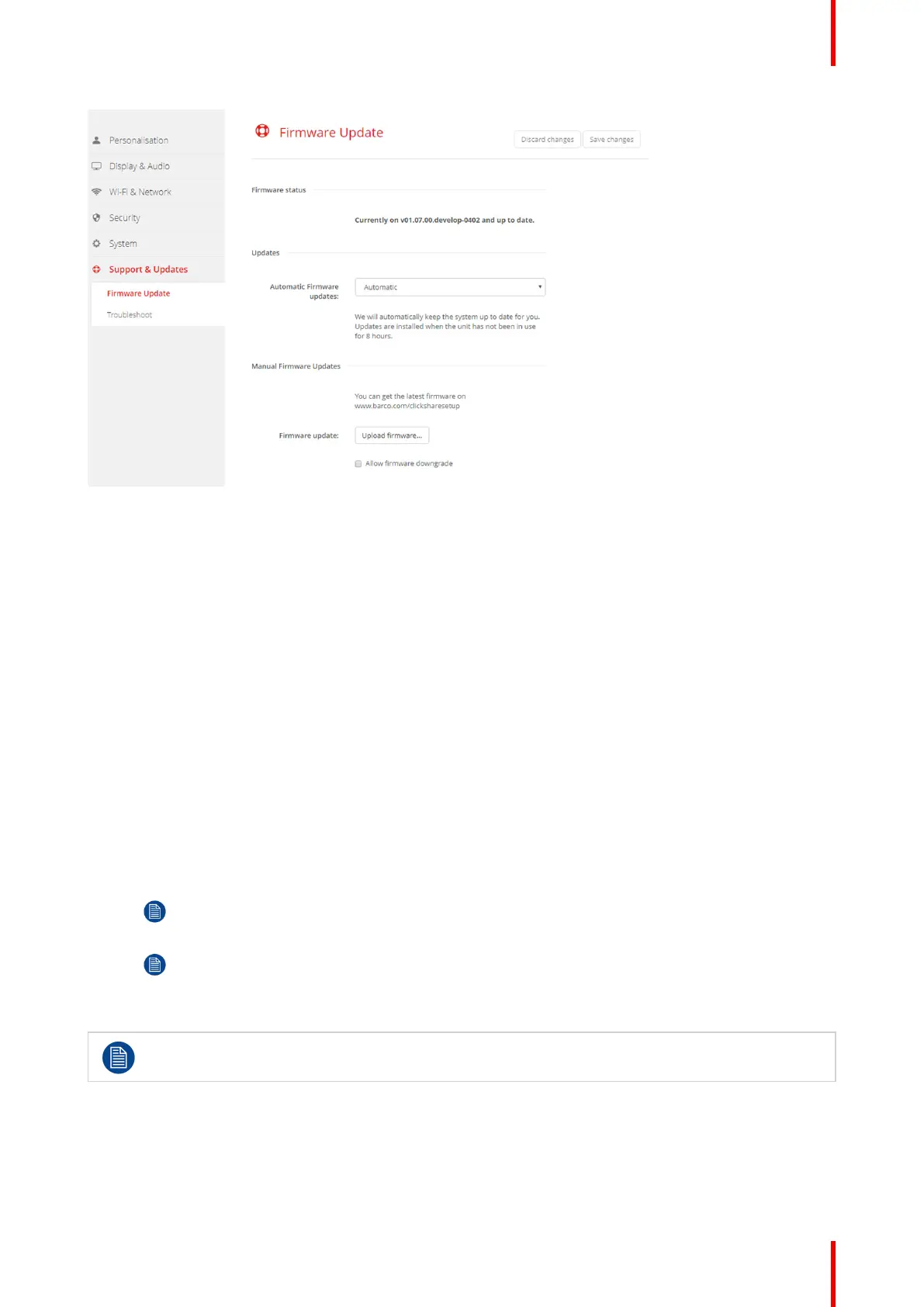 dashboard and firmware page. The update can then be initiated via the Support & Updates > Firmware