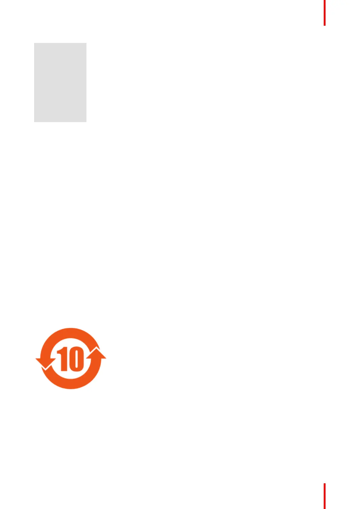 求》标准贴上环保使用期限(EFUP)标签。Barco产品所采用的EFUP标签(请参阅实例,徽标内部的编号使