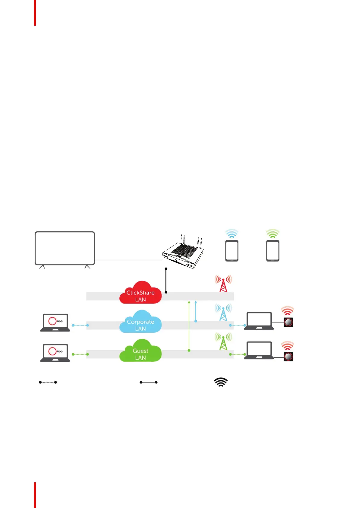 In this integration mode, the ClickShare Base Unit is connected to a dedicated physical or virtual LAN via a
