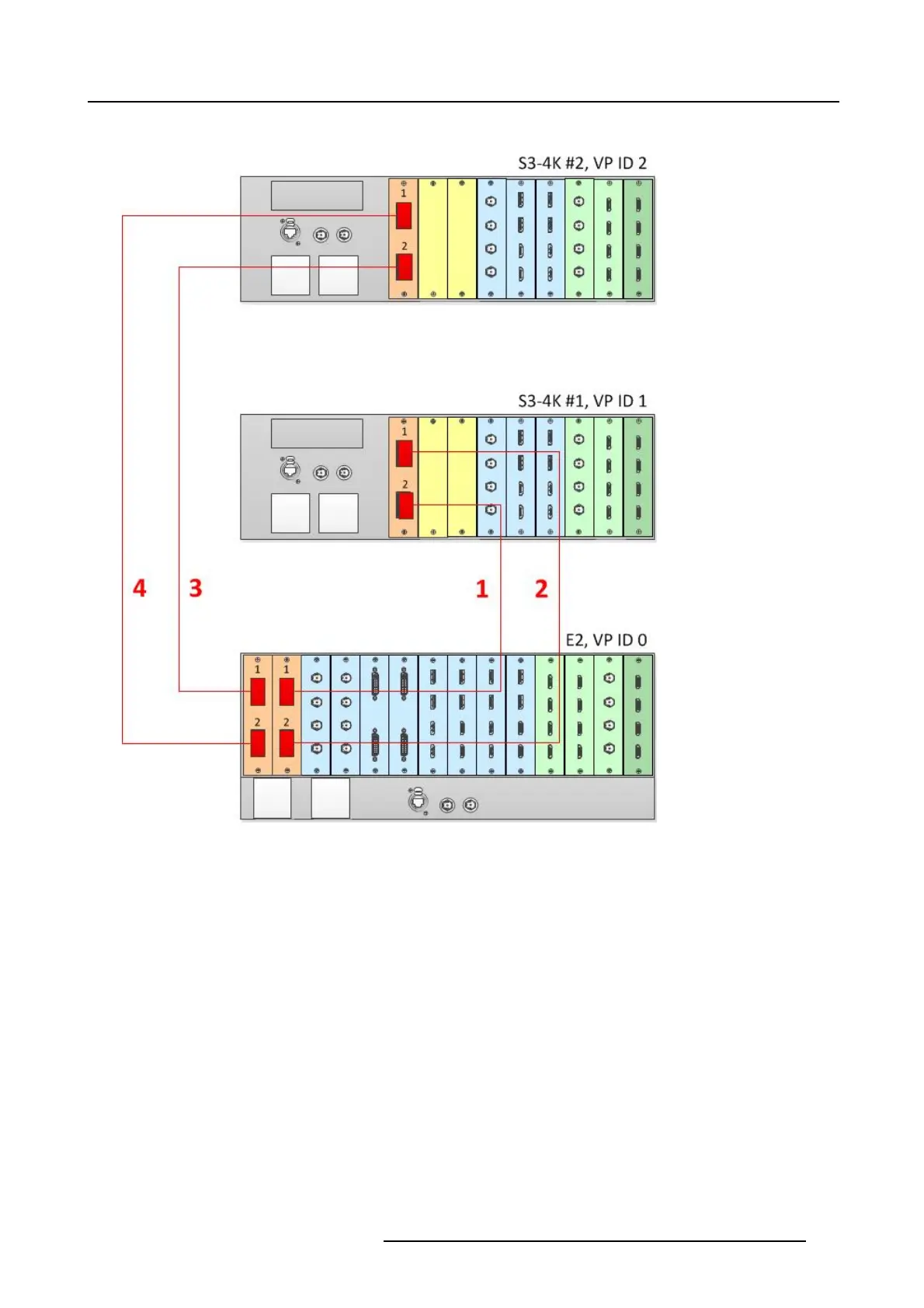 See image 6-32for an example of the cabling between an E2 unit and two S3-4K units.