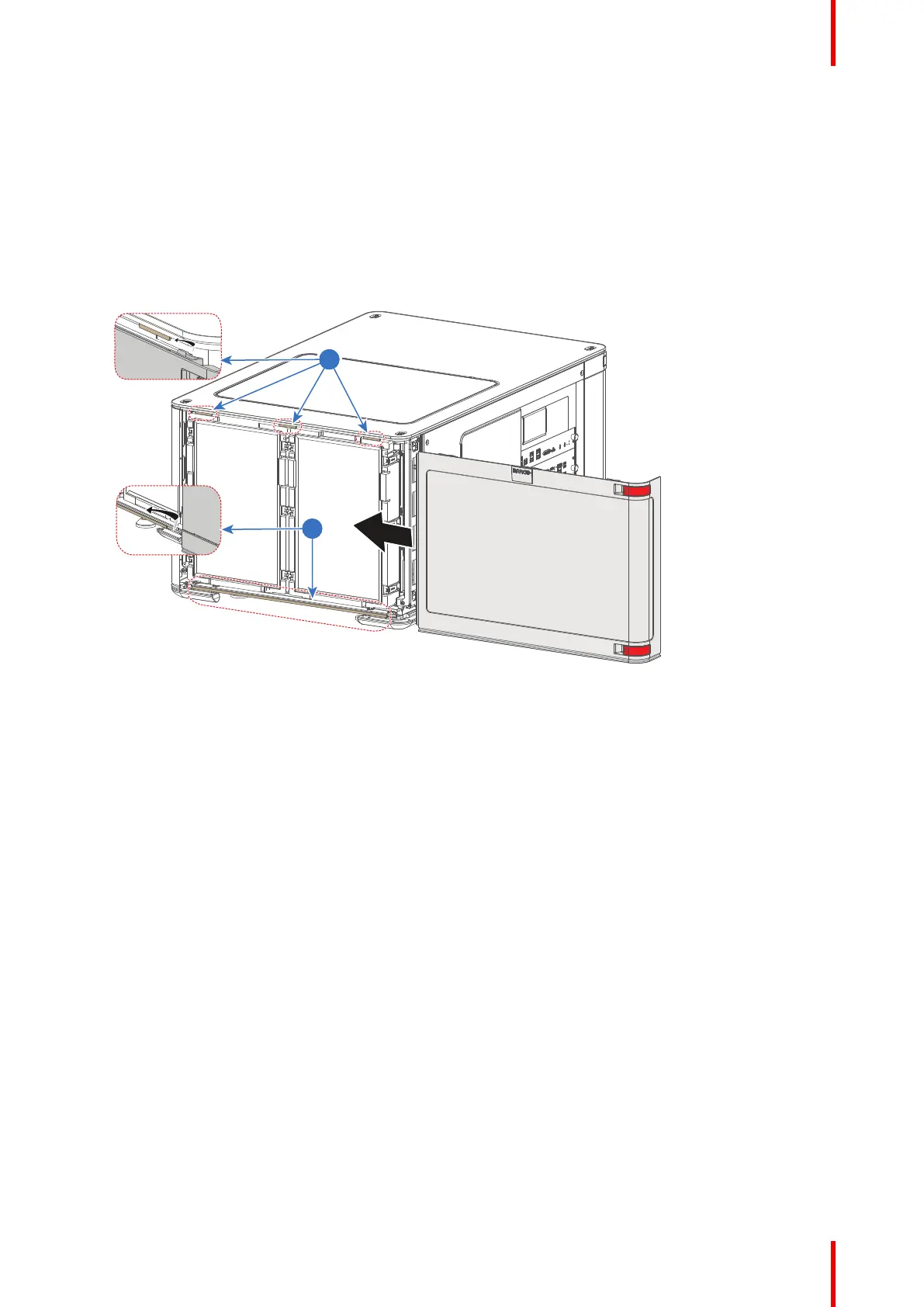 2. Slide the clips in the rear cover over the cover hooks in the top of the frame (reference 2).