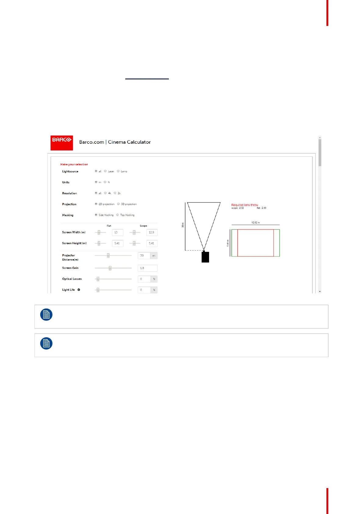 The lens calculator allows you to have an overview of which lenses are suitable for your specific projector