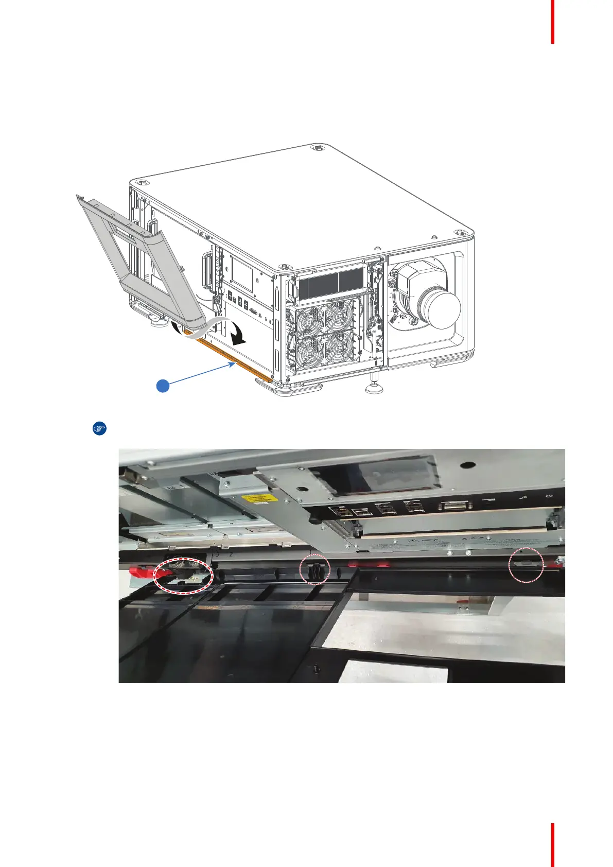 1. Place the cover onto the hook located on the bottom of the projector frame (reference 1).