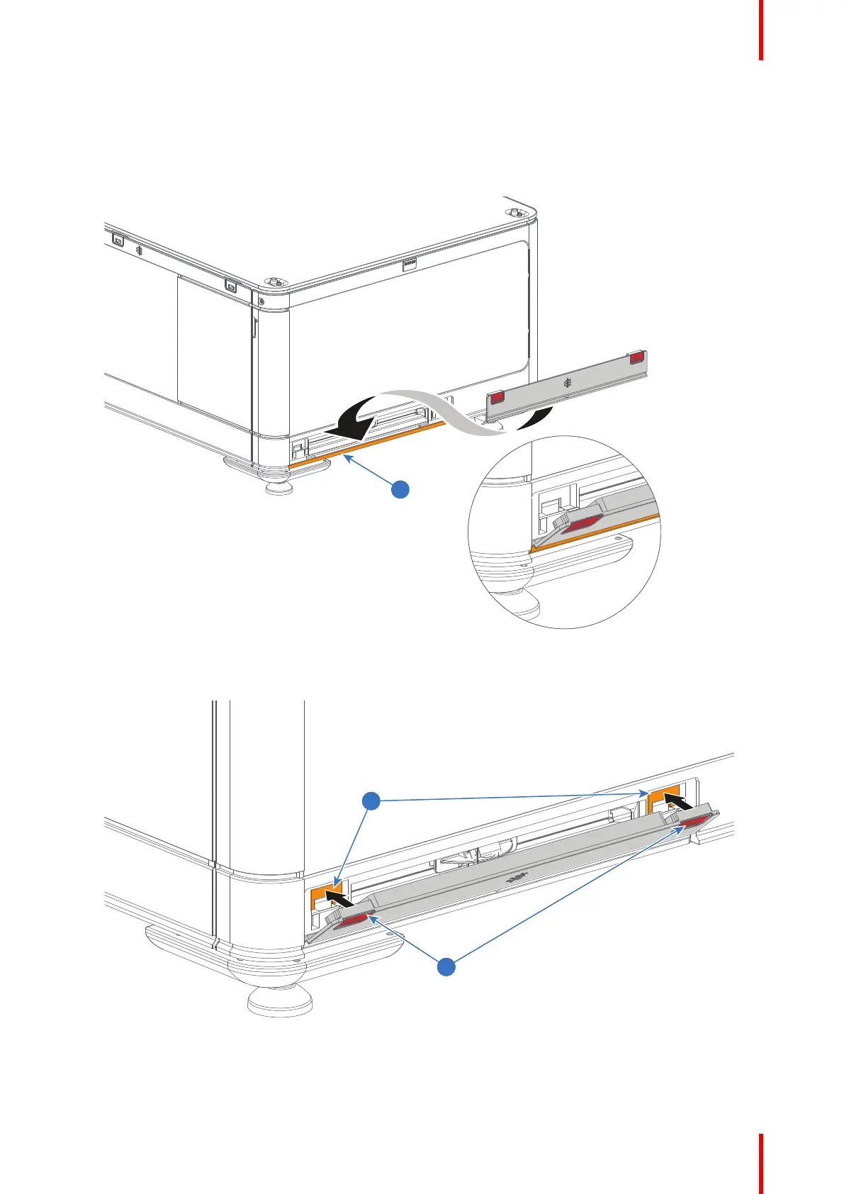 1. Place the cover over the cover hook on the bottom of the projector frame (reference 1).