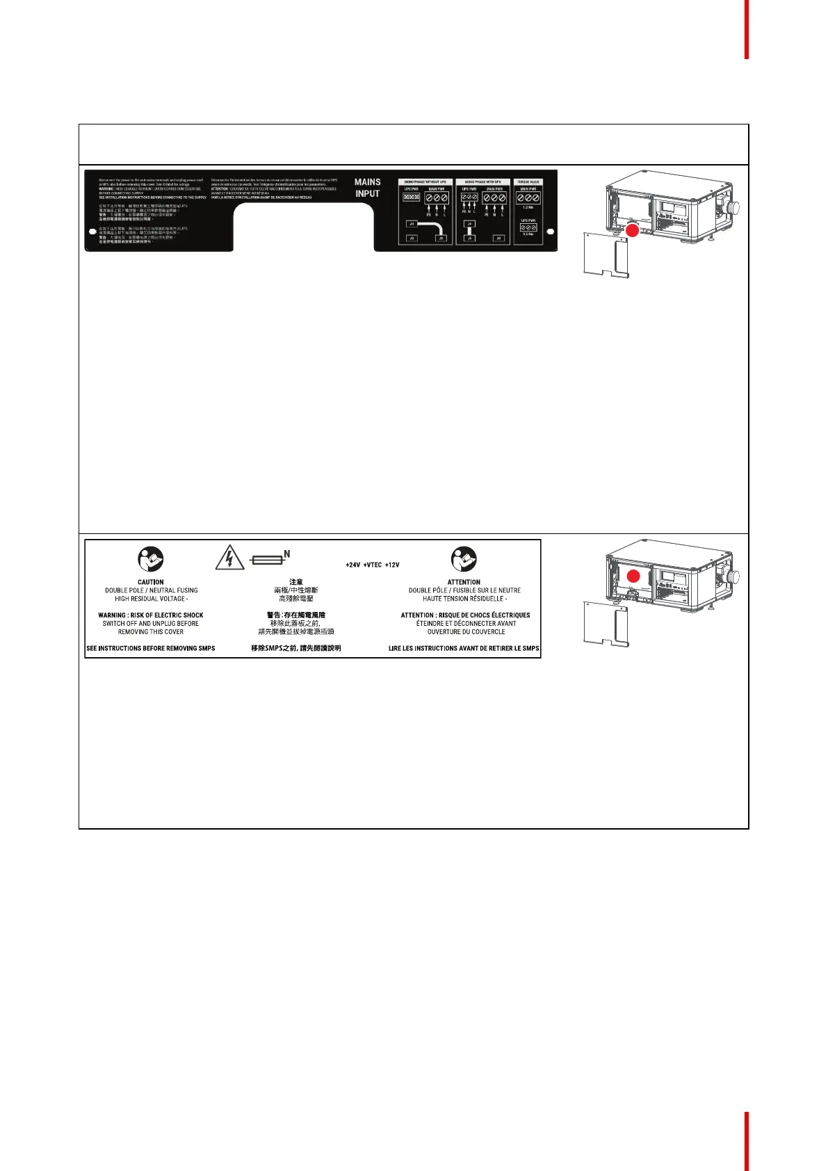 注意 兩極/中性熔斷 高殘餘電壓. 警告:存在觸電風險 移除此蓋板之前, 請先