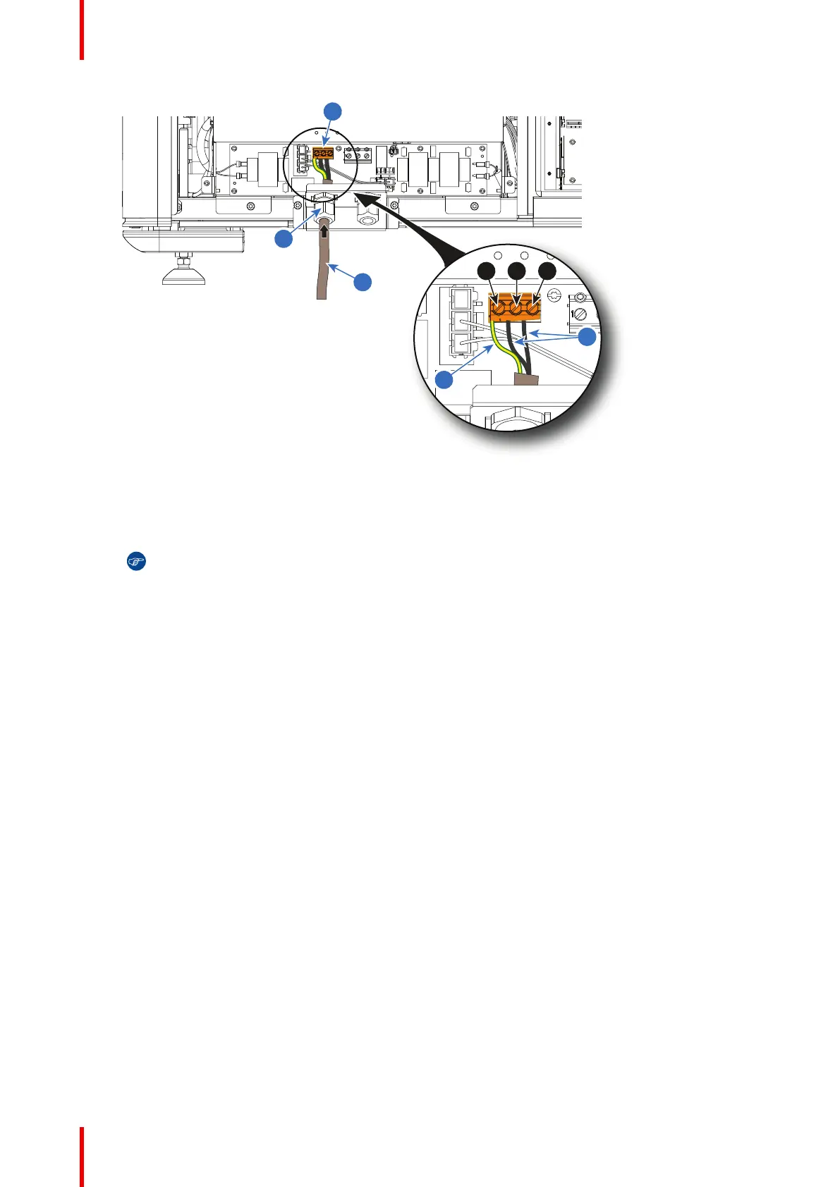 4. Secure the AC power cord by fastening the cable gland (reference 2). Use a 24mm open-end wrench.