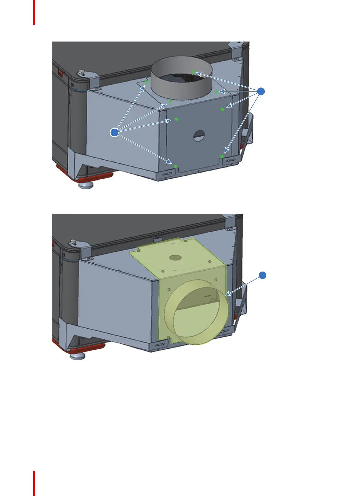3. Tighten the eight TX M4 screws (reference 1) to secure the part with the air outlet (reference 2).